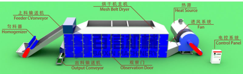 辣椒烘干機也是多層帶式辣椒烘干設備主要是有:上料系統、烘干系統、加熱系統、出料系統組成,分別包括上料輸送機,均料器,烘干主機,出料輸送機、大風機、小風機、熱源,傳動機和控制柜。